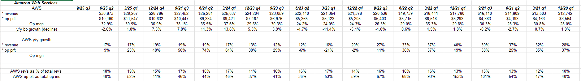 AWS’s operating margin has been as a low as 24% in Q1 ’23, while peak operating margin happened in Q1 ’25 at 39.5%, so historically there is some volatility around the operating margin for AWS.