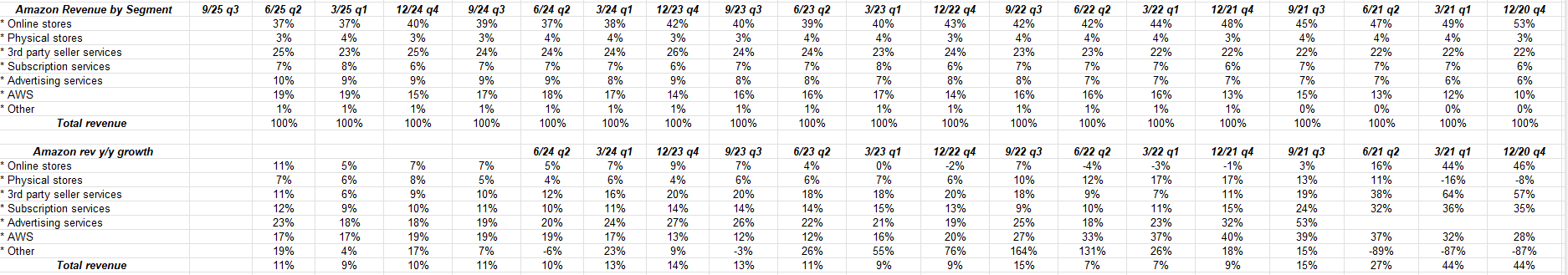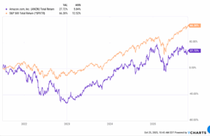 Amazon is just up 2% YTD as of 10/24/25, versus the SP 500’s 15% YTD return, and you can see from the chart posted higher in the write-up that the stock has lagged greatly since mid-2021.
