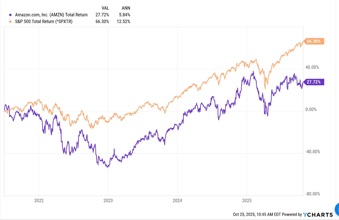 Jeff Bezos officially resigned from Amazon on July 5th, 2021. The above chart shows the performance of Amazon’s stock price relative to the SP 500’s total return, from July 5th, 2021 as of October 24, 2025. Rounding the above numbers for time, Amazon’s total return in the last 4 years has underperformed the SP 500 total return by about 600 bp’s a year.