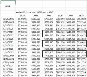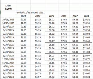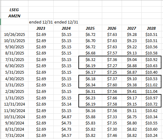 The rows for both Amazon’s consensus EPS and revenue estimates, show the change after the quarterly reports in March, April ’25, and then June, July ’25. We’ll have to wait until this week is done to see what October 31 metrics hold.