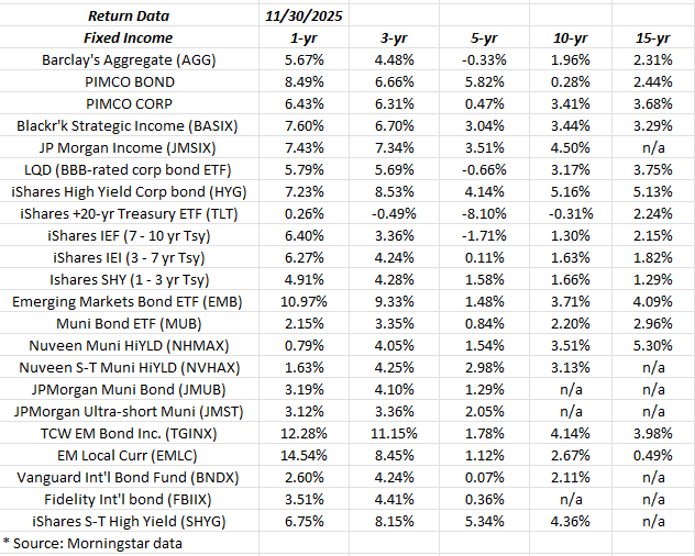 Here’s a quick look at annual returns across the fixed-income classes as of 11/30/25, with emerging markets income leading the way, and municipal bond returns lagging.