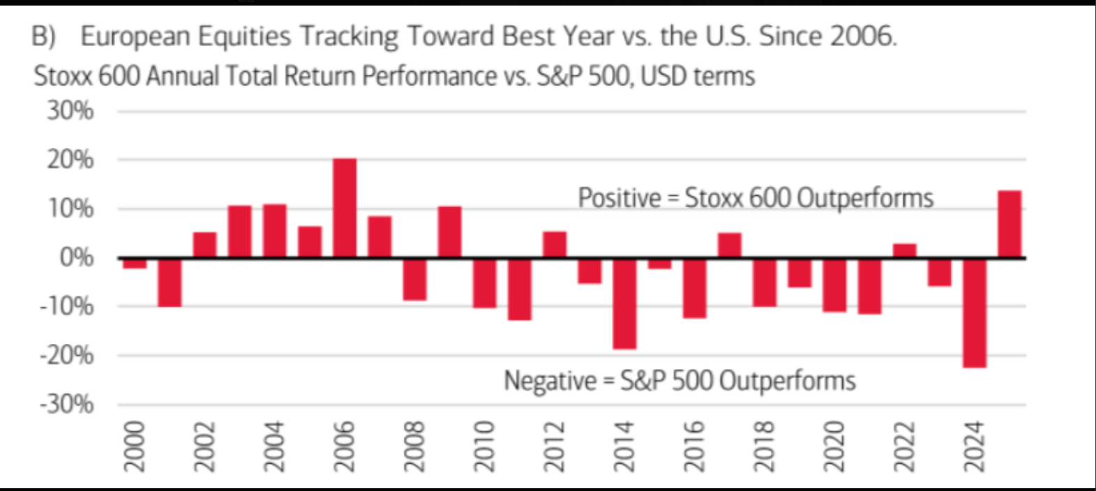 Per this bar chart, European equity is having it’s best year vs US since 2006. European equities are being driven by the big banks, and the anti-immigration policies of Italy and Germany, not to mention the US mandating that NATO commit 5% – 6% of GDP to NATO defense, after previously relying on the generosity of America to foot what is thought to be about 70% of the NATO defense bill. (Source Google and Grok).