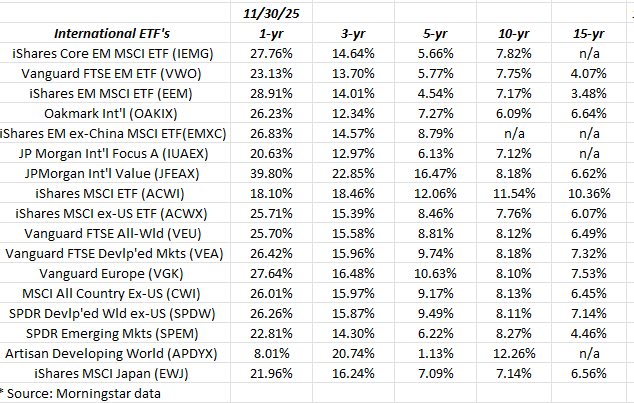 The point is (some) international has seen a lamp lit underneath it. Looking at longer-term annual returns, the 5,10 and 15-year international returns are still attractive relative to the SP 500 and large-cap US indices.