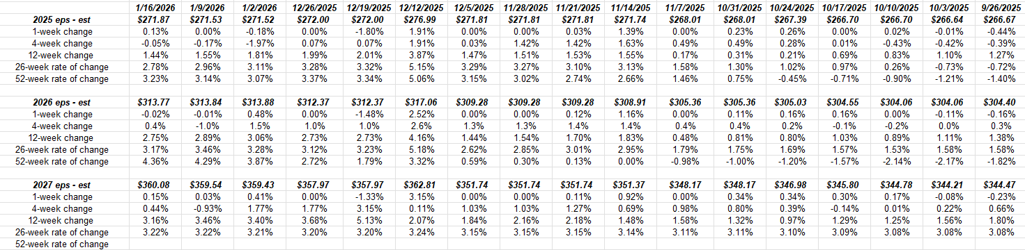Readers should expand the spreadsheet and note the increase in calendar EPS estimates from 12/5/25 to 12/12/25 and then back down again the following week of 12/19/25.