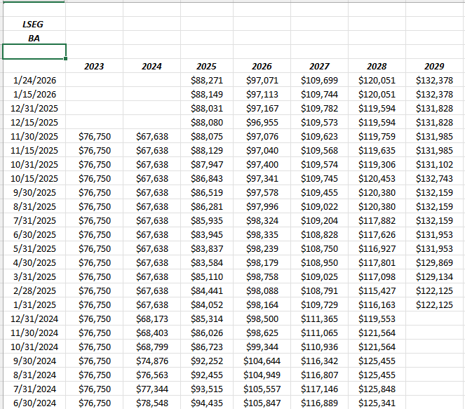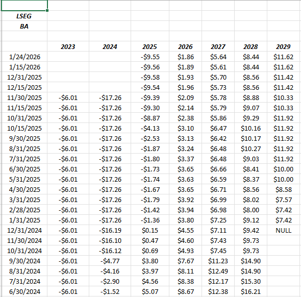 Here’s the next 3 years “expected” calendar EPS for BA as of January 23 ’26, and the multiple based on Friday’s market close: