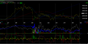 While the stock is very “overbought” on the daily chart, the weekly chart for BA shows the stock less exuberant (so to speak).