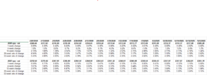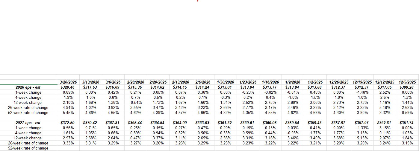 There is a couple of different ways this blog slices and dices earnings data from LSEG: one is to track the annual EPS estimates published each week and note the “rate of change” for each period on the spreadsheet.