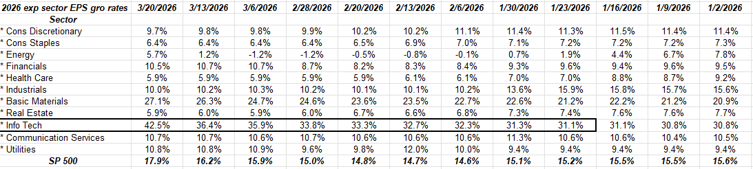 This expected SP 500 sector EPS growth estimates for 2026 shows that technology estimates have been revised S-H-A-R-P-L-Y higher since mid-February ’26, and my educated guess is a a big chunk of this is Oracle (ORCL) and Micron Technology (MU) which reported last week.
