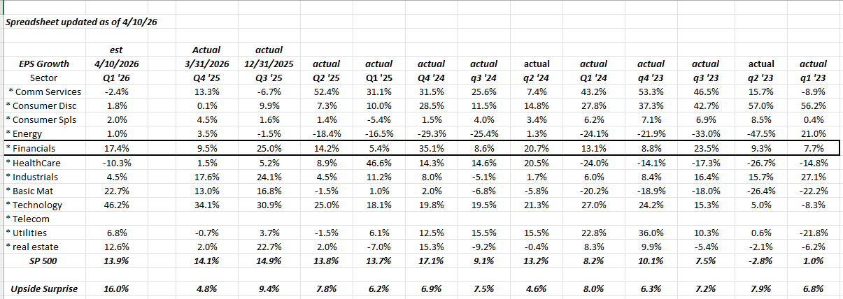 The one interesting aspect to the financial sector numbers, is that Q1 ’26 is lapping a pretty weak quarter in Q1 ’25. In Q1 ’25, the financial sector EPS growth was just +5.3%, while actual revenue growth was just +3%.