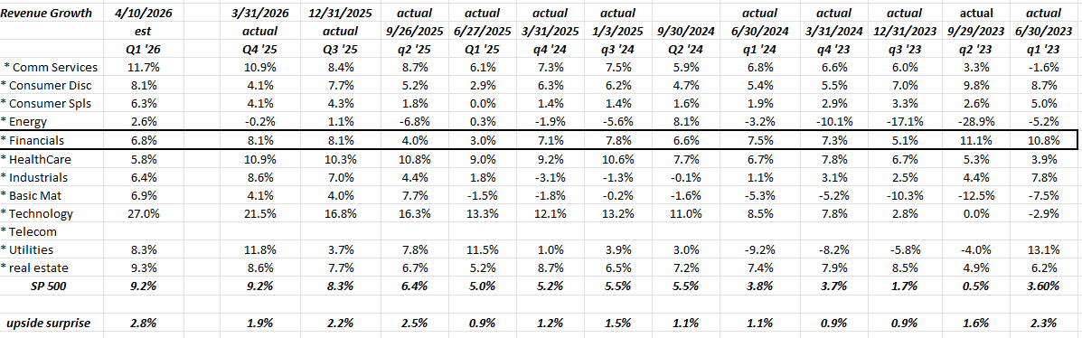 Looking at actual and expected revenue growth for financials, the average revenue growth per growth, for the sector, the last 12 quarters is 7.2%, while the estimated rev growth for Q1 ’26, is 6.8%.