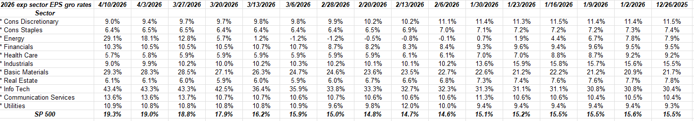2026 SP 500 expected sector EPS growth rates continue to rise, even this latest week, and after the 4 – 5 weeks of Iran-filled headlines.