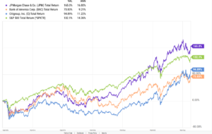In terms of stock total returns, (thanks to Ycharts), JPMorgan has been the top performer of the above-three names, even beating the SP 500, since 12/31/19, or just prior to Covid. Citigroup’s annual return is #2 and Bank of America is #3, but unlike JPMorgan, and Citi trailed the SP 500 during this 6 year and 3 month period.