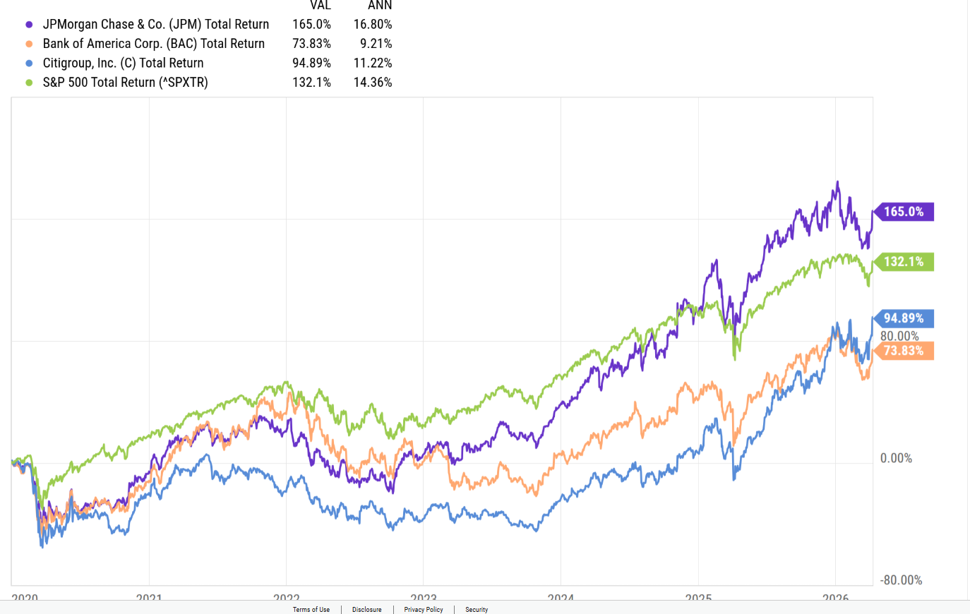 Last quarter, Q4 ’24, JPM net revenue of +8% and EPS of 9%, with above-Street guidance on net interest income (NII), asset management and equity and fixed-income trading BUT this was all pre-Iran. JPM also guided to 10% expense growth (per Morningstar) as well after Q4 ’25 results, so we will see if any of the current Iran-related events cause the guidance to be tempered for Q2 ’26 and beyond.