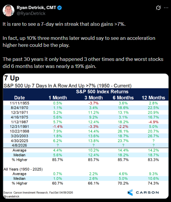 Here’s a good post from Ryan Detrick of Carson Group that shows the SP 500’s 7% jump in 7 days, and then “expected forward returns”.